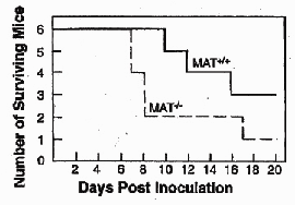 また別の例として、サルモネラ菌(食中毒菌)をマウスに与えた実験が報告されている4)。マウスは、小腸の上皮細胞からディフェンシン前駆体を分泌し、病原菌が来ると、ディフェンシン前駆体の一部を切り取って、抗菌力のあるディフェンシンを作って、これで病原菌を攻撃して身を守るが、この実験では、抗菌力のあるディフェンシンを作れないマウスを使用して、普通のマウスの場合と比較している。まず、マウス6匹ずつに、289,000個のサルモネラ菌を与えたのが、下図の実験で、普通のマウス(図の実線)では10日目で1匹死んだのに対し、ディフェンシン欠損マウス(図の破線)は8日目までに4匹が死んでしまった。また、サルモネラ菌の数をいろいろに変えた実験では、マウスの半分が死ぬサルモネラ菌の数(LD50)は、普通のマウスでは114,000個なのに対し、ディフェンシン欠損マウスでは14,100個だった。つまり、ディフェンシン欠損マウスは、約十分の一の数のサルモネラ菌で死んでしまうという結果になった。もしも、与えたサルモネラ菌がディフェンシン耐性菌であった場合、普通のマウスでも、ディフェンシン欠損マウスと同様に、十分の一の数のサルモネラ菌で死んでしまうと考えられる。この実験も、ディフェンシン耐性菌が、普通の病原菌よりも大きな感染力を持つことを示している。